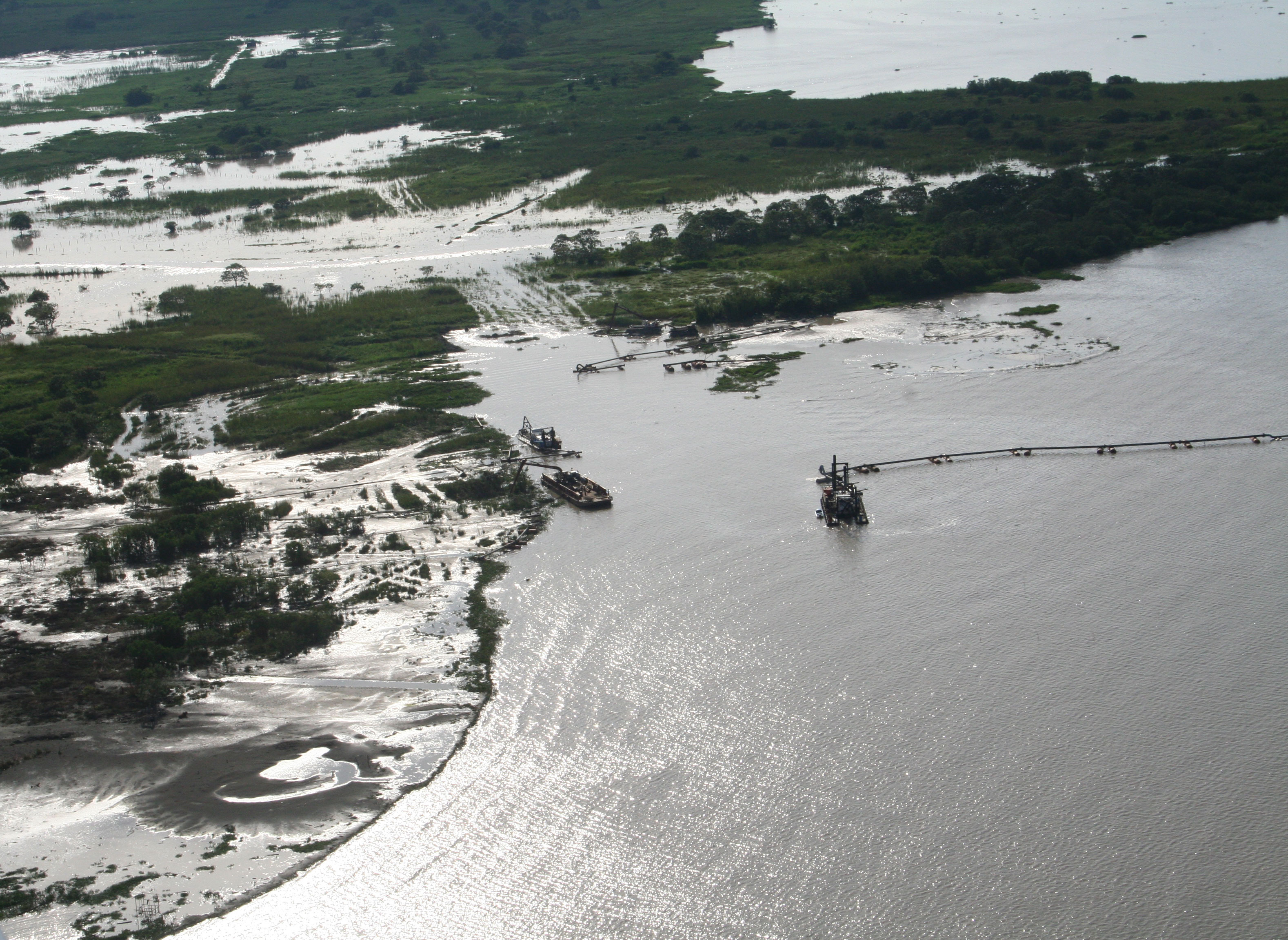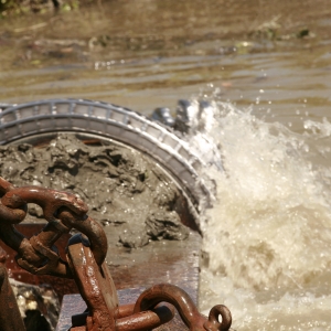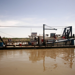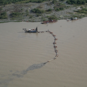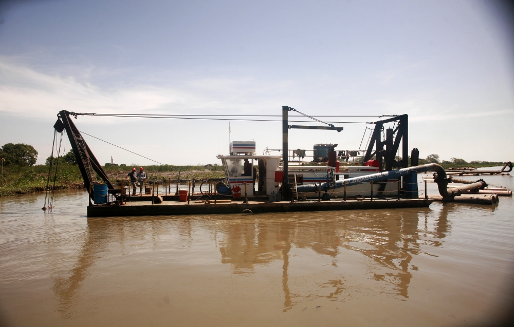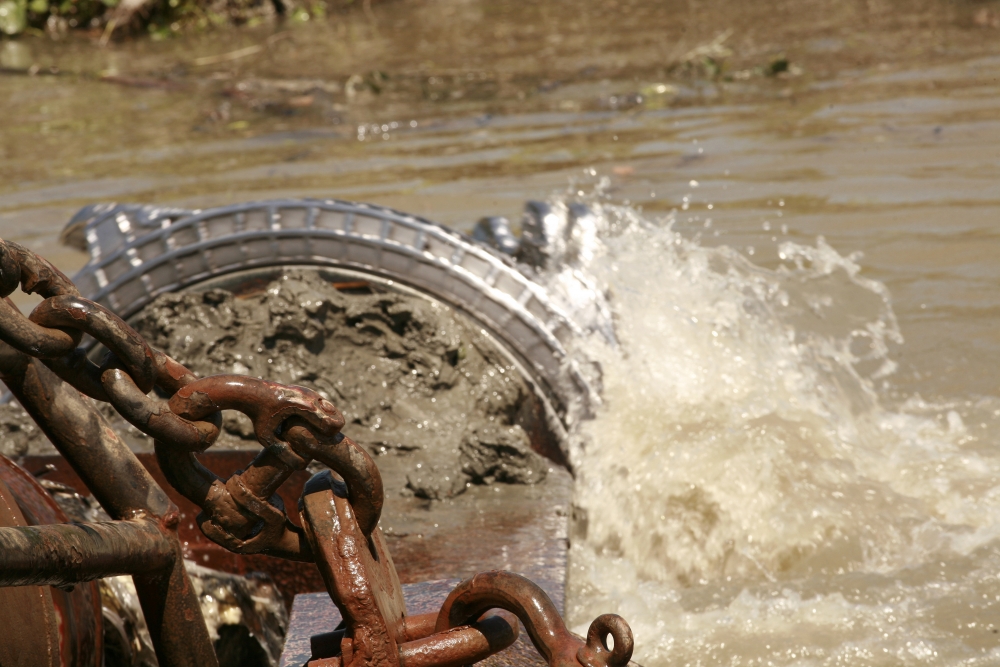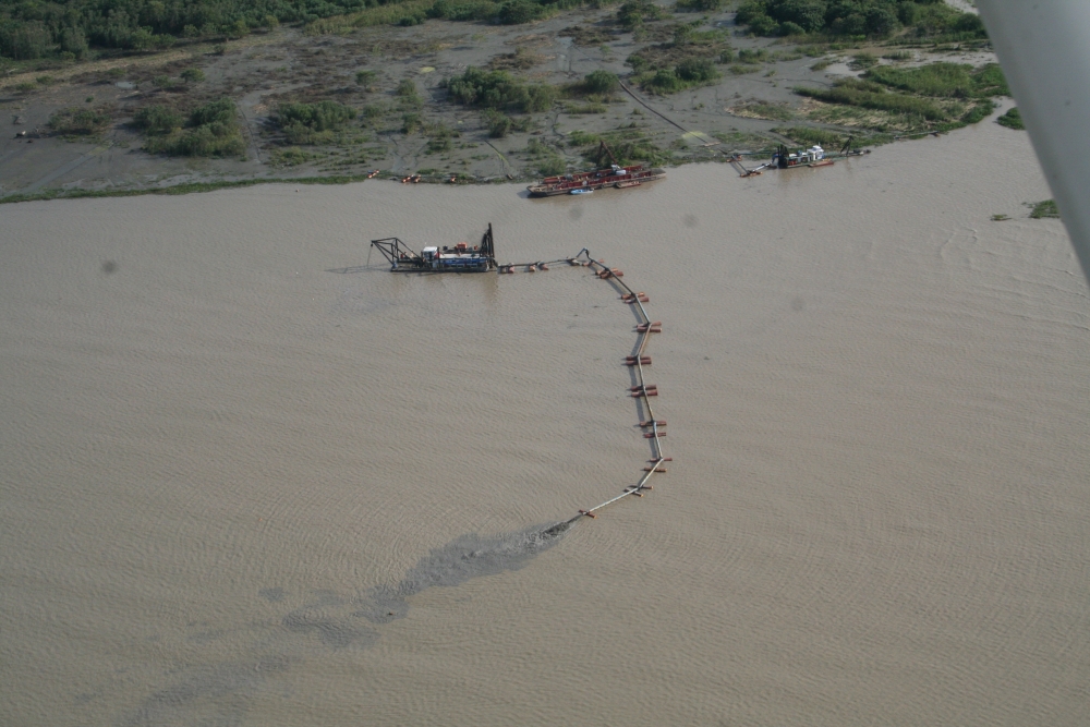 Draga de corte y succión, excavador de largo alcance, gabarra plana y remolcador.