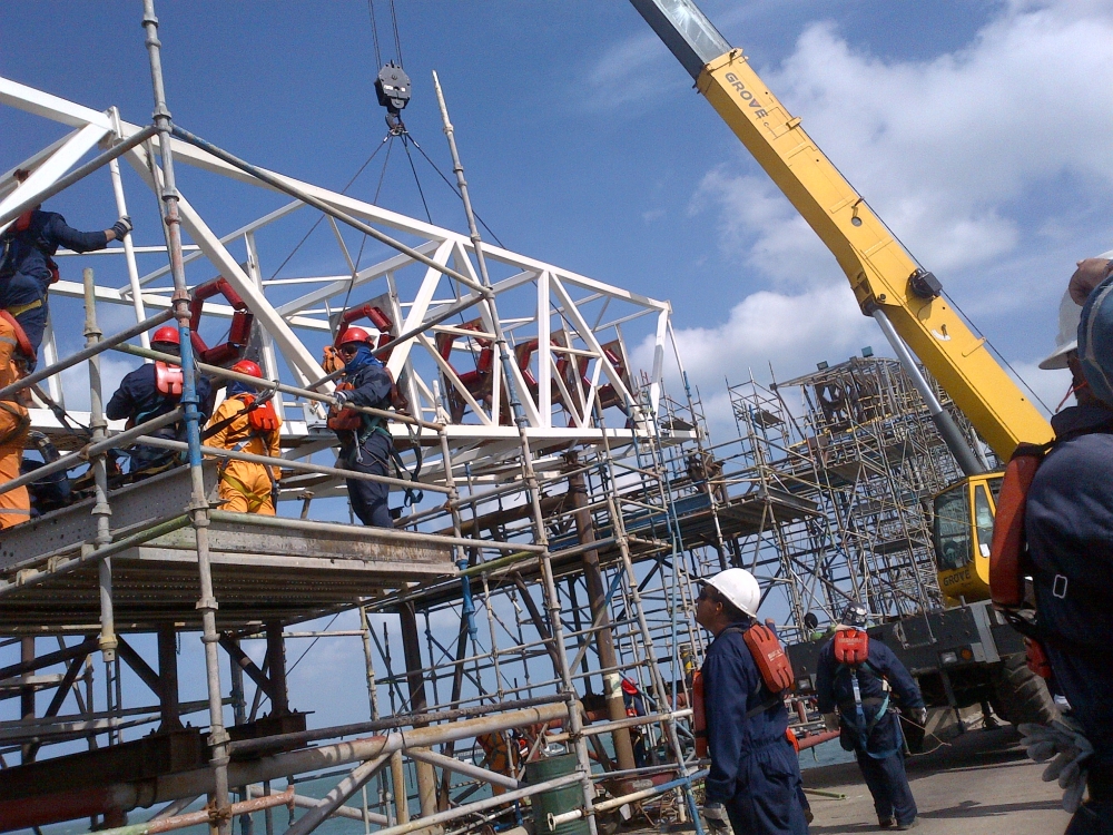 Grúa, montacarga, equipo de fabricación de estructuras metálicas, máquinas de soldar, gabarra grúa y remolcador.