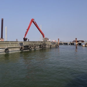 Excavador de largo alcance, gabarra plana y remolcador.